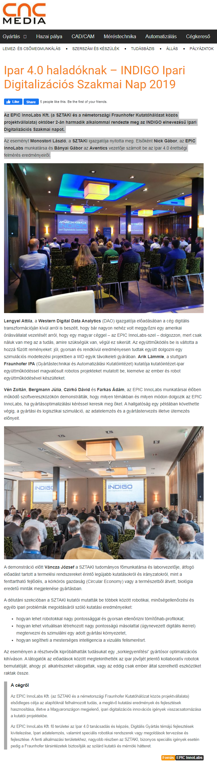 Az EPIC InnoLabs Kft. (a SZTAKI és a németországi Fraunhofer Kutatóhálózat közös projektvállalata) október 2-án harmadik alkalommal rendezte meg az INDIGO elnevezésű Ipari Digitalizációs Szakmai napot. Az eseményt Monostori László, a SZTAKI igazgatója nyitotta meg. Elsőként Nick Gábor, az EPIC InnoLabs munkatársa és Bányai Gábor az Aventics vezetője számolt be az Ipar 4.0 érettségi felmérés eredményeiről.