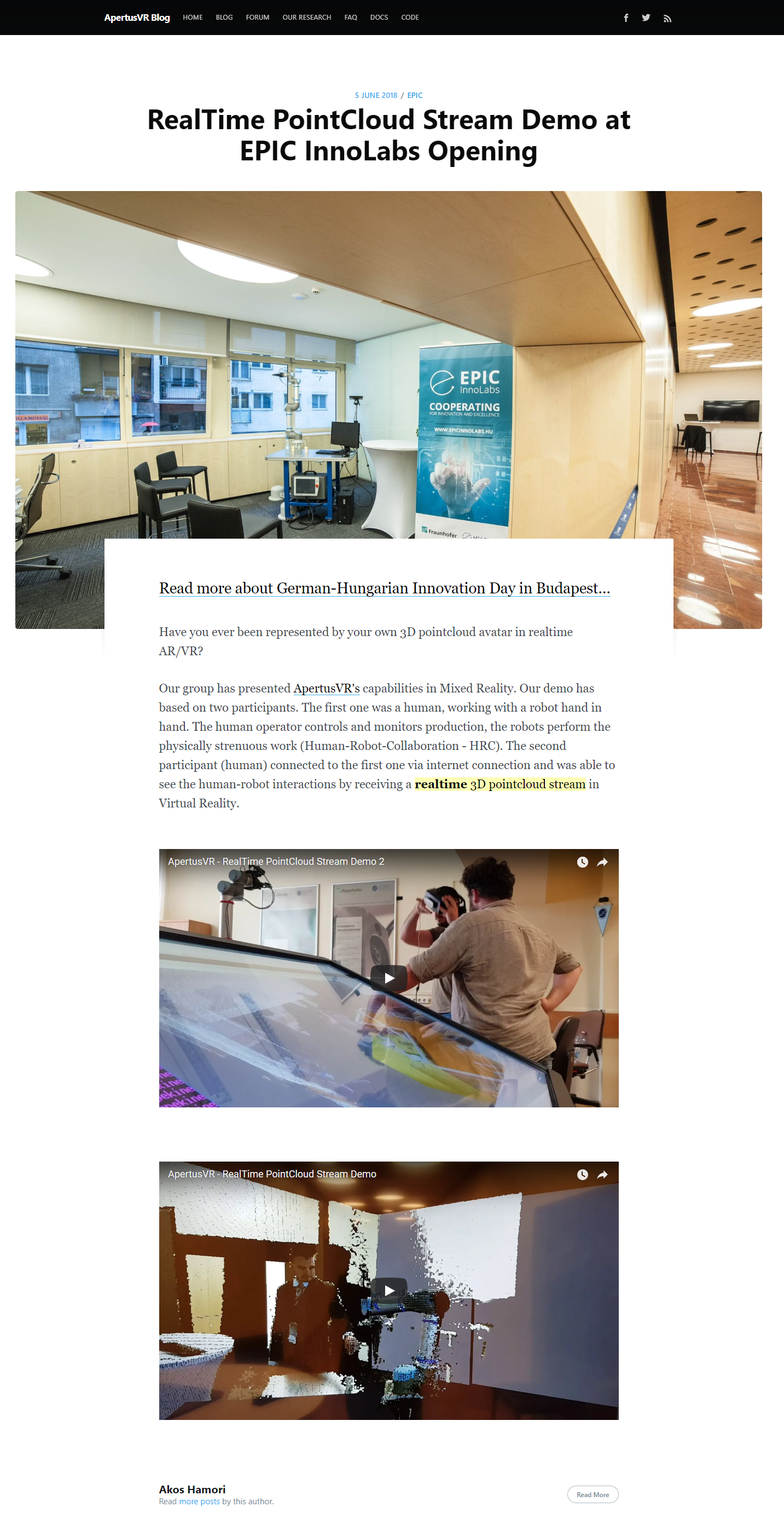 Have you ever been represented by your own 3D pointcloud avatar in realtime AR/VR? Our group has presented ApertusVR's capabilities in Mixed Reality. Our demo has based on two participants. The first one was a human, working with a robot hand in hand. The human operator controls and monitors production, the robots perform the physically strenuous work (Human-Robot-Collaboration - HRC).